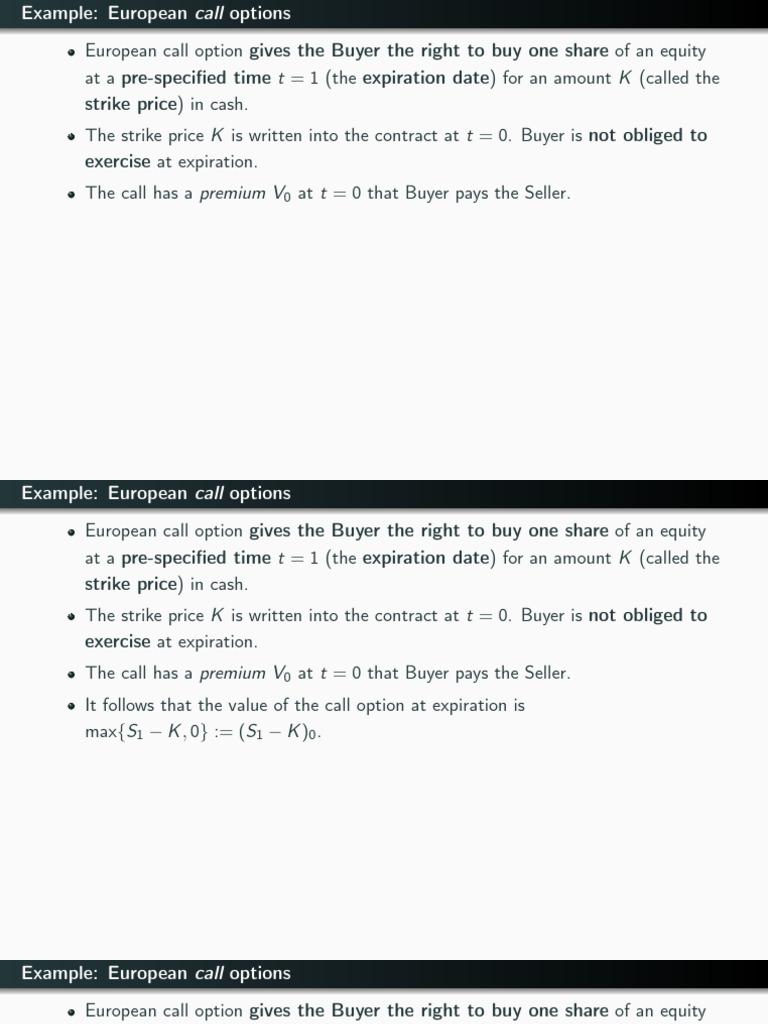 at a pre-specified time t = 1 (the expiration date) for an amount K (called the