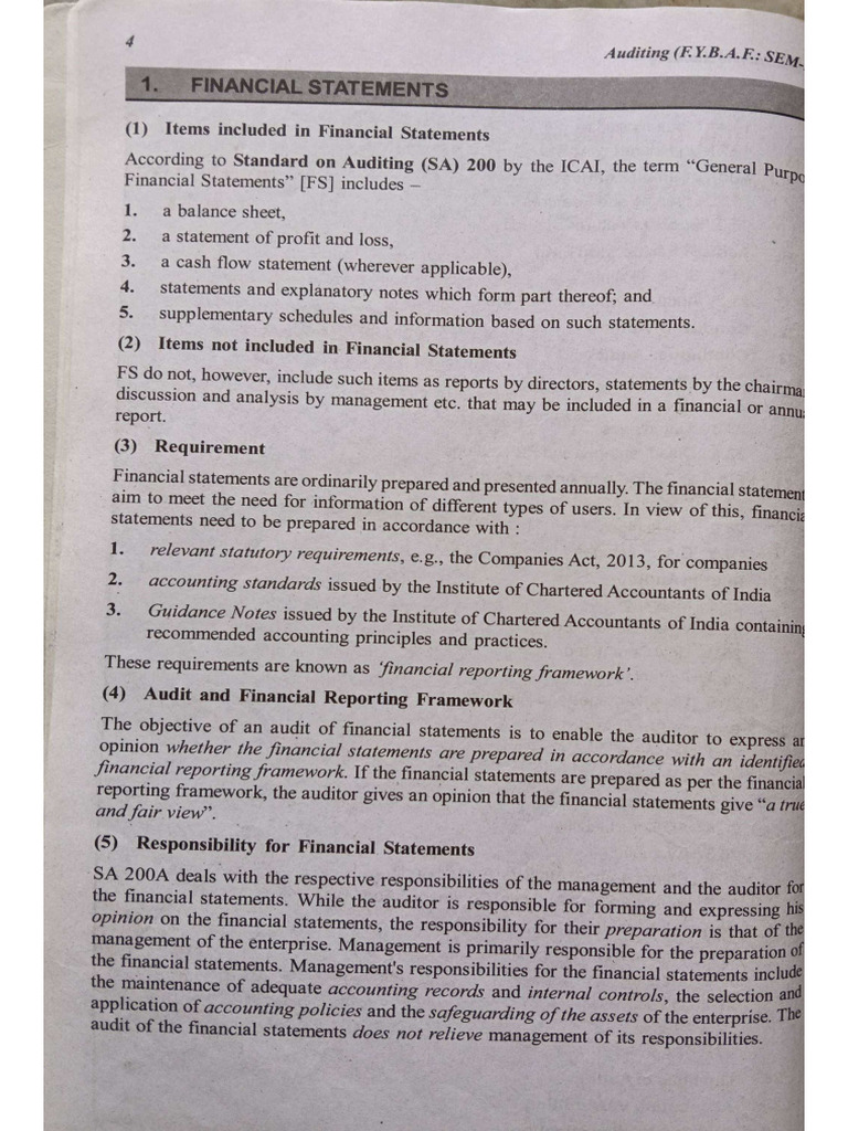 The document outlines the components and requirements of financial statements as per auditing standards, emphasizing the responsibilities of management and auditors in preparing and reviewing these statements. It defines auditing as an independent examination of financial information aimed at expressing an opinion on its reliability, while also noting the importance of detecting errors and frauds as a secondary objective. The document highlights the need for financial statements to comply with statutory requirements and accounting standards to ensure they present a true and fair view of an entity's financial position.