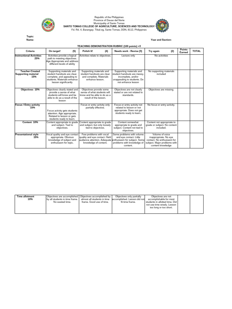 TEACHING DEMONSTRATION RUBRIC (100 points) +3