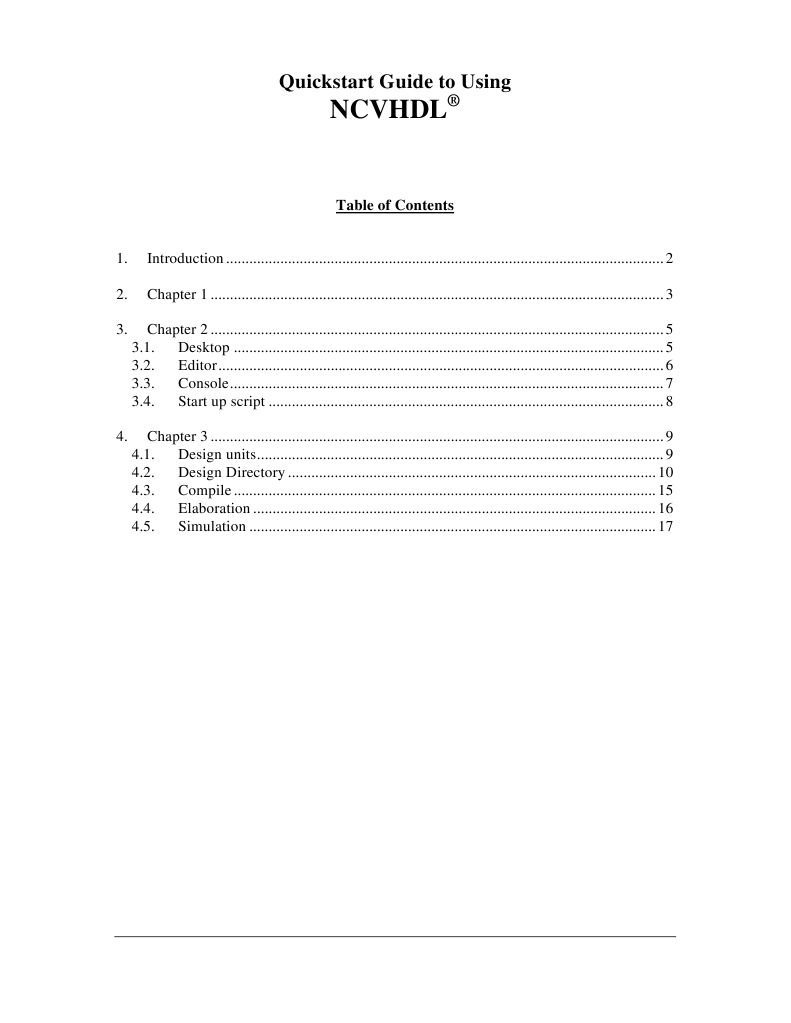 Introduction ................................................................................................................. 2 Chapter 1 ..................................................................................................................... 3 Chapter 2 ..................................................................................................................... 5 3.1. Desktop ............................................................................................................... 5 3.2. Editor................................................................................................................... 6 3.3. Console................................................................................................................ 7 3.4. Start up script ...................................................................................................... 8 Chapter 3 ..................................................................................................................... 9 4.1. Design units......................................................................................................... 9 4.2. Design Directory ............................................................................................... 10 4.3. Compile ............................................................................................................. 15 4.4. Elaboration ........................................................................................................ 16 4.5. Simulation ......................................................................................................... 17