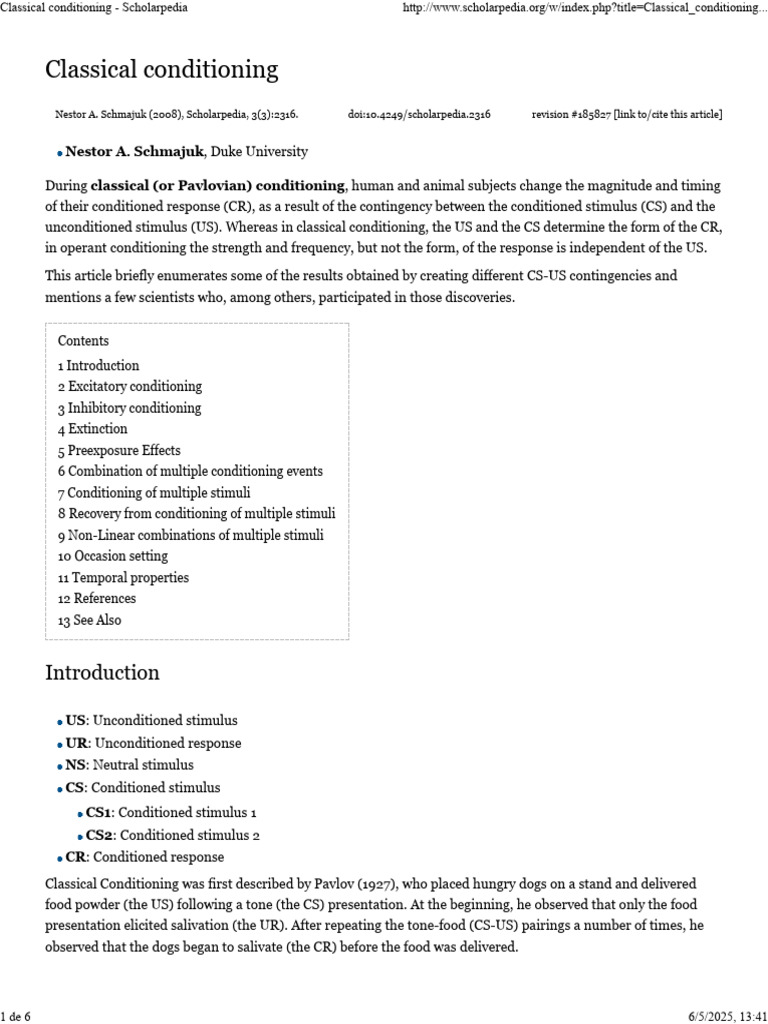 Classical conditioning - Scholarpedia http://www.scholarpedia.org/w/index.php?title=Classical_conditioning...