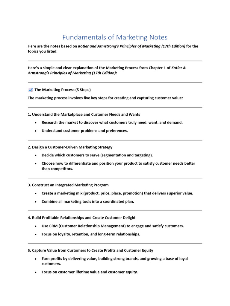 Here are the notes based on Kotler and Armstrong’s Principles of Marketing (17th Edition) for the