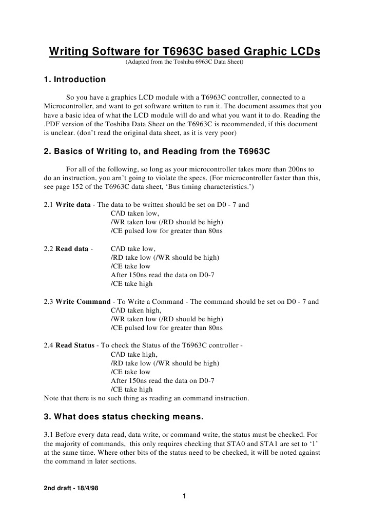 So you have a graphics LCD module with a T6963C controller, connected to a Microcontroller, and want to get software written to run it. The document assumes that you have a basic idea of what the LCD module will do and what you want it to do. Reading the .PDF version of the Toshiba Data Sheet on the T6963C is recommended, if this document is unclear. (dont read the original data sheet, as it is very poor)