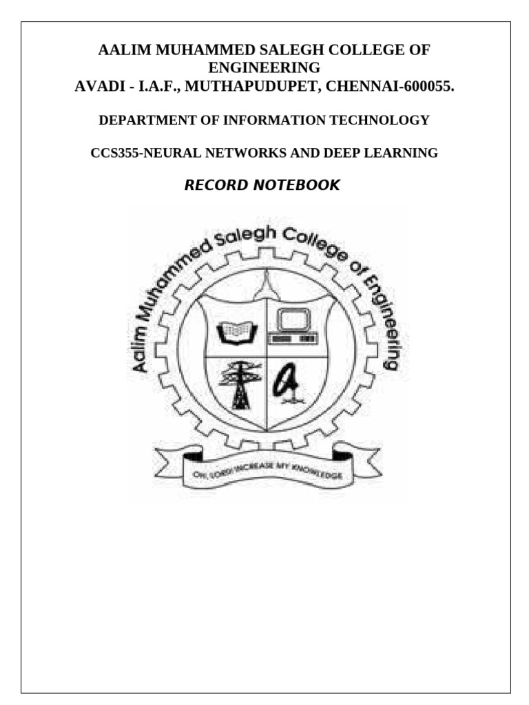 The document is a record notebook for the course CCS355 on Neural Networks and Deep Learning. It is associated with the Department of Information Technology at Aalim Muhammed Salegh College of Engineering in Chennai. The notebook is intended for academic use in the specified course.
