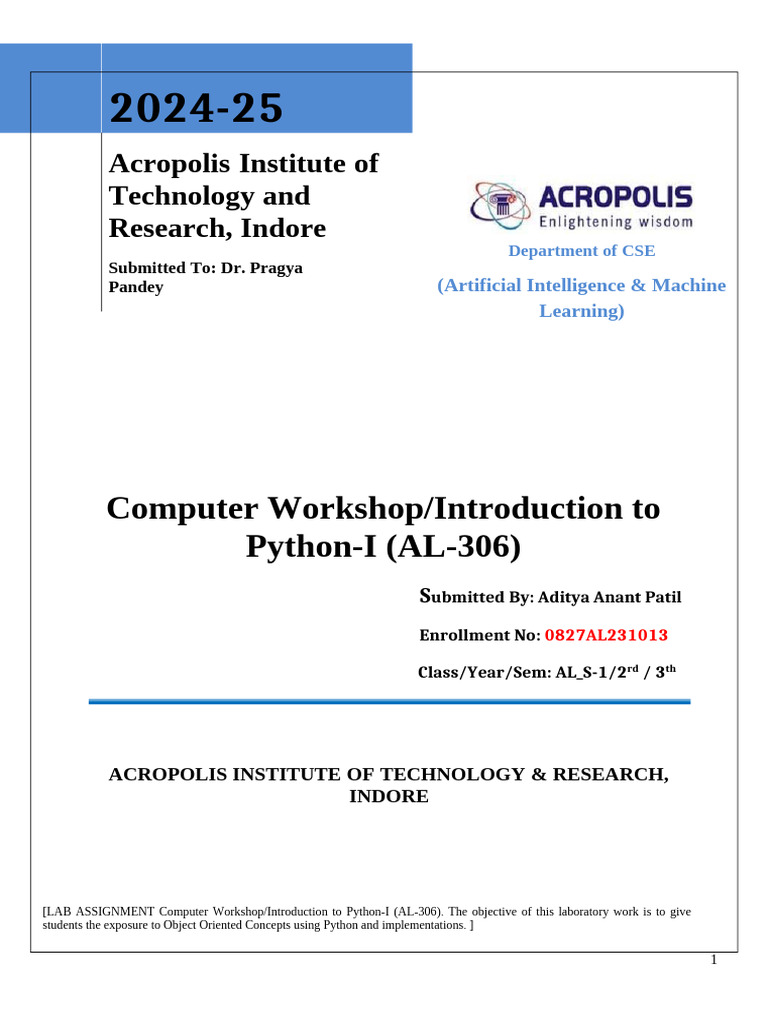 [LAB ASSIGNMENT Computer Workshop/Introduction to Python-I (AL-306). The objective of this laboratory work is to give