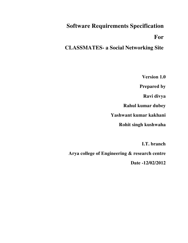 This software Requirement Specification (SRS) documents key specification, functional & nonfunctional requirements of social network service. Social networking sites tend to share some conventional features. Most often, individual users are encouraged to create profiles containing various information about themselves. Users can often upload pictures of themselves to their profiles, post blog entries for others to read, search for other users with similar interests, and compile and share lists of contacts. In addition, user profiles often have a section dedicated to comments from friends and other users. To protect user privacy, social networks usually have controls that allow users to choose who can view their profile, contact them, add them to their list of contacts, and so on.