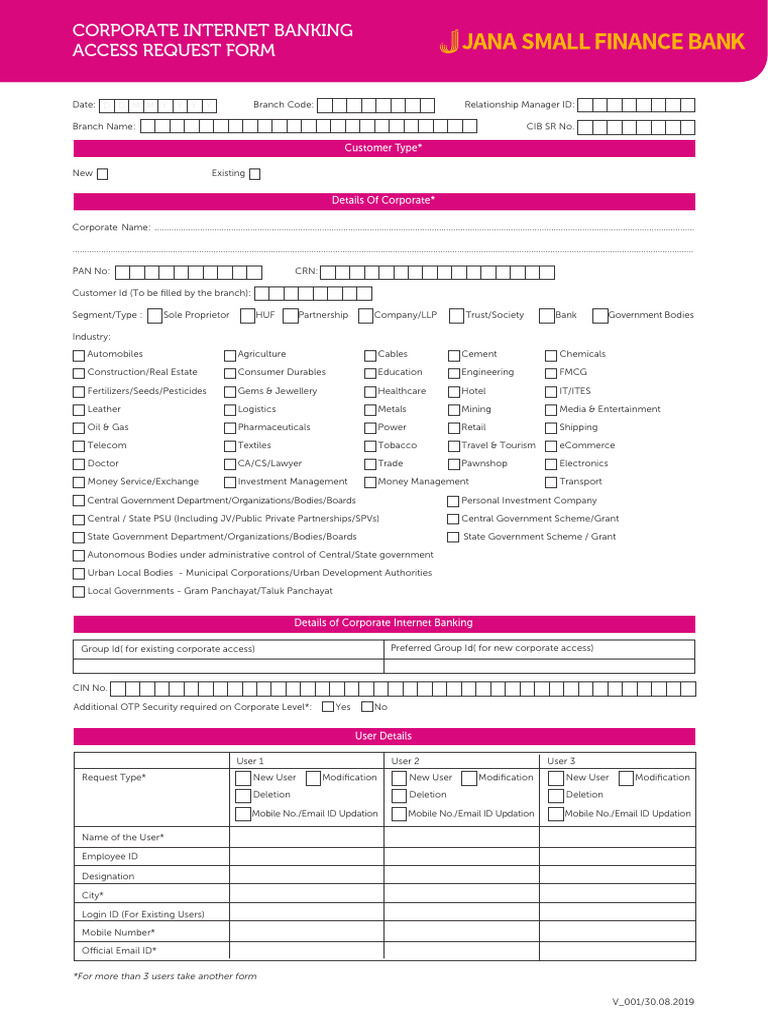 I/We agree to all the Terms and Conditions of Corporate Internet Banking of Jana Small Finance Bank Limited.