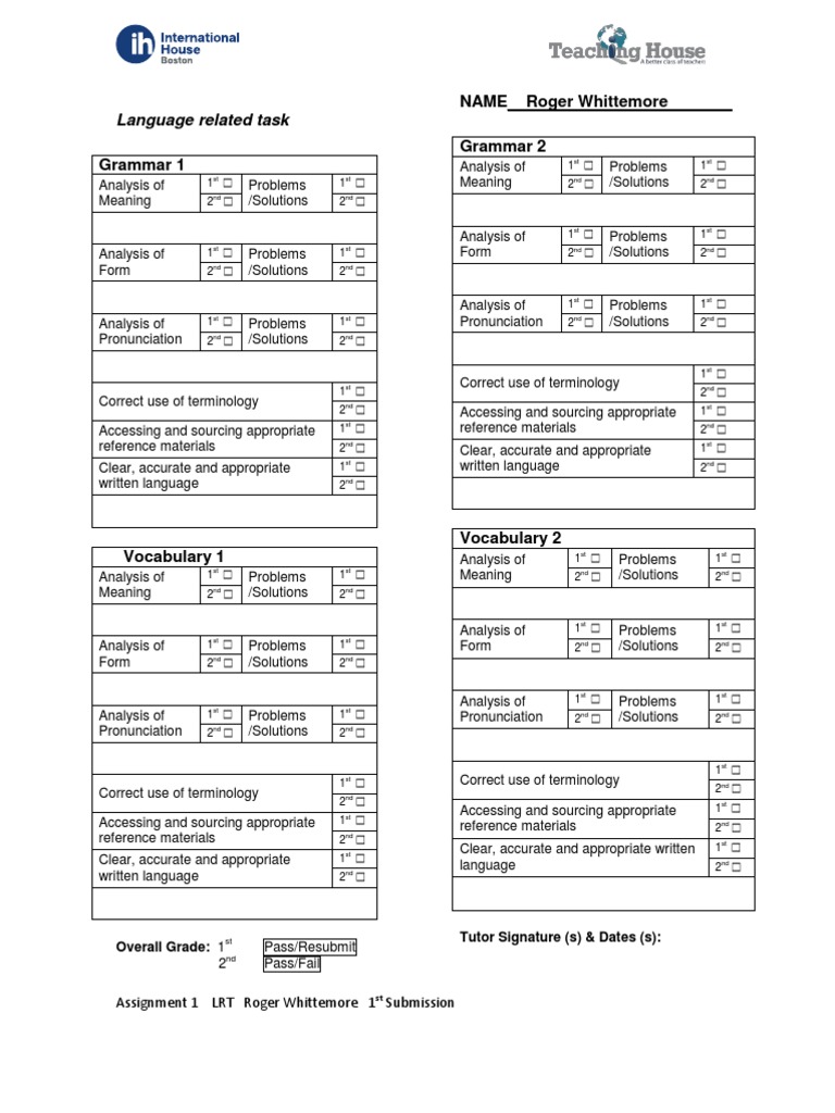 Cambridge ESOL specifies that for this assignment successful candidates can demonstrate their learning by: Analyzing language correctly for teaching purposes Correctly using terminology relating to form, meaning and pronunciation when analyzing language Accessing reference materials and referencing information they have learned about language to an appropriate source Using written language that is clear, accurate and appropriate to the task