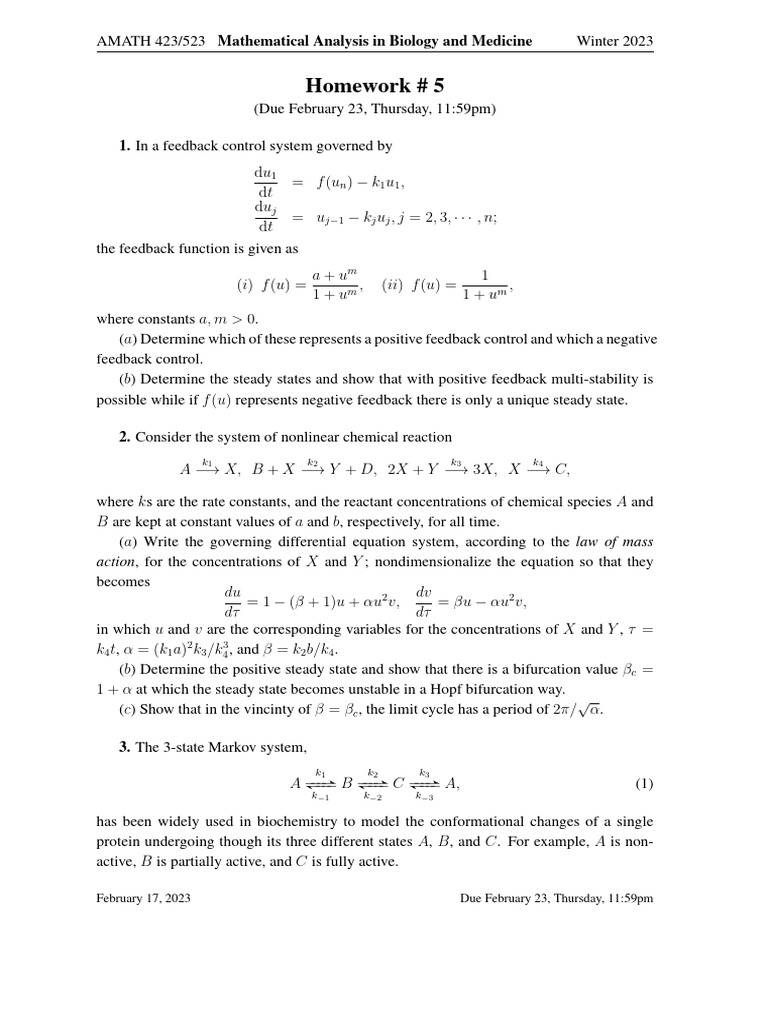 AMATH 423/523 Mathematical Analysis in Biology and Medicine Winter 2023