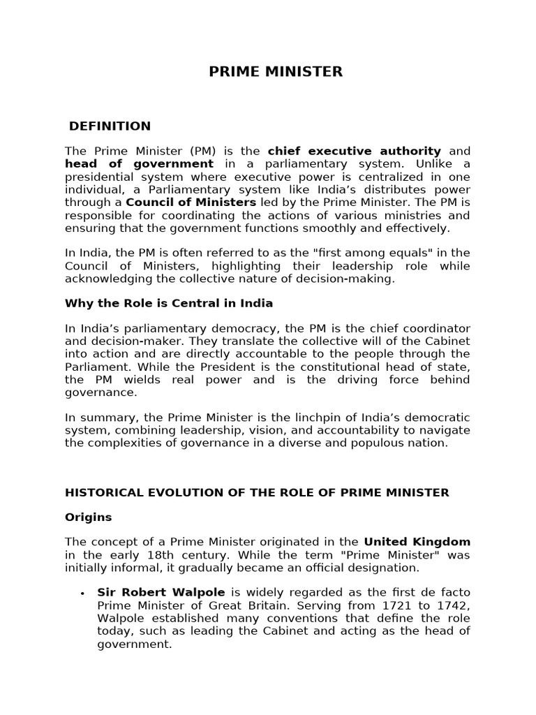 HISTORICAL EVOLUTION OF THE ROLE OF PRIME MINISTER