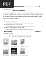 The document contains fill-in-the-blank statements related to general knowledge. It prompts the reader to provide answers about their country, food, the sky, clothing, and where books are stored. The statements are simple and aim to test basic knowledge and comprehension.