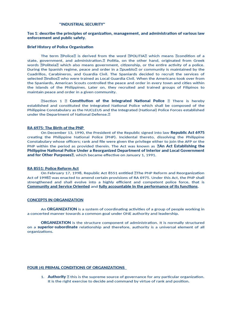 Tos 1: describe the principles of organization, management, and administration of various law