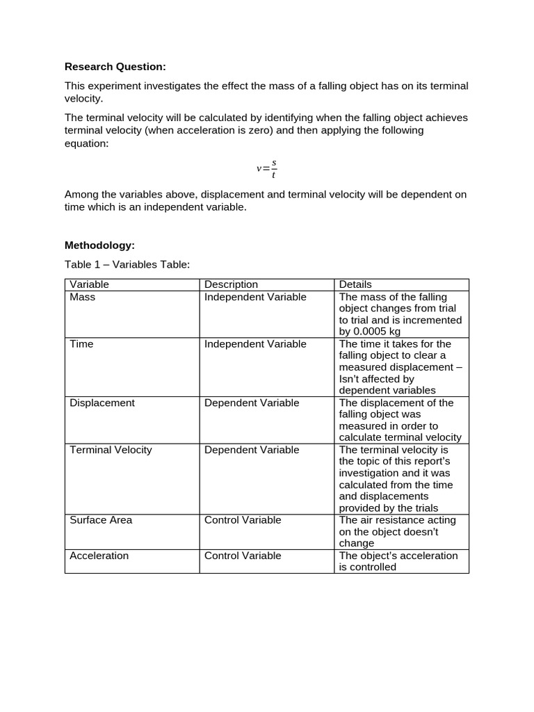 terminal velocity since surface area was a controlled variable. As a result of this, it is