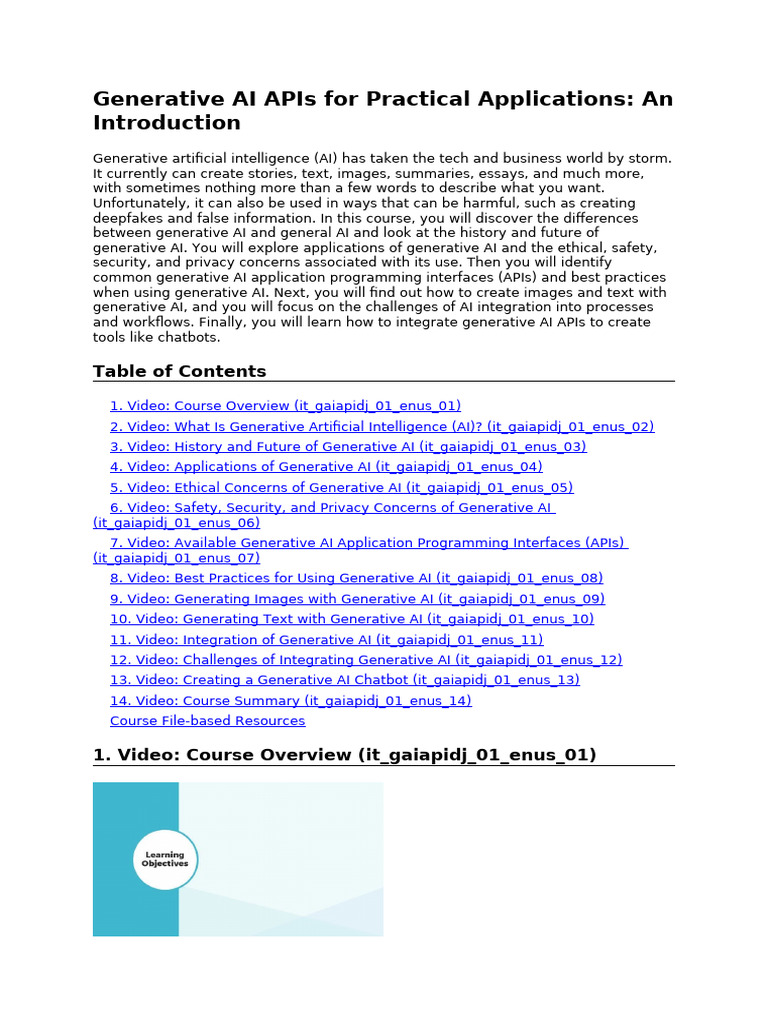 and workflows. Finally, you will learn how to integrate generative AI APIs to create