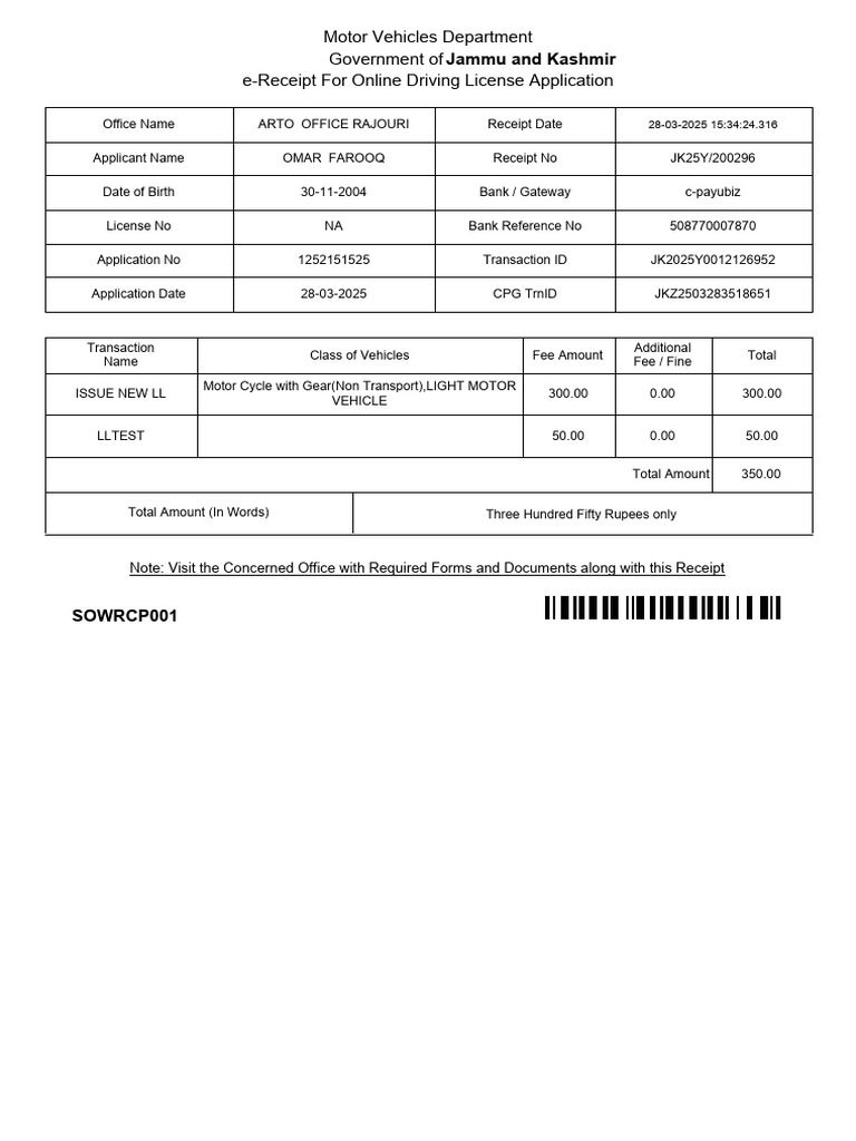 Office Name ARTO OFFICE RAJOURI Receipt Date 28-03-2025 15:34:24.316