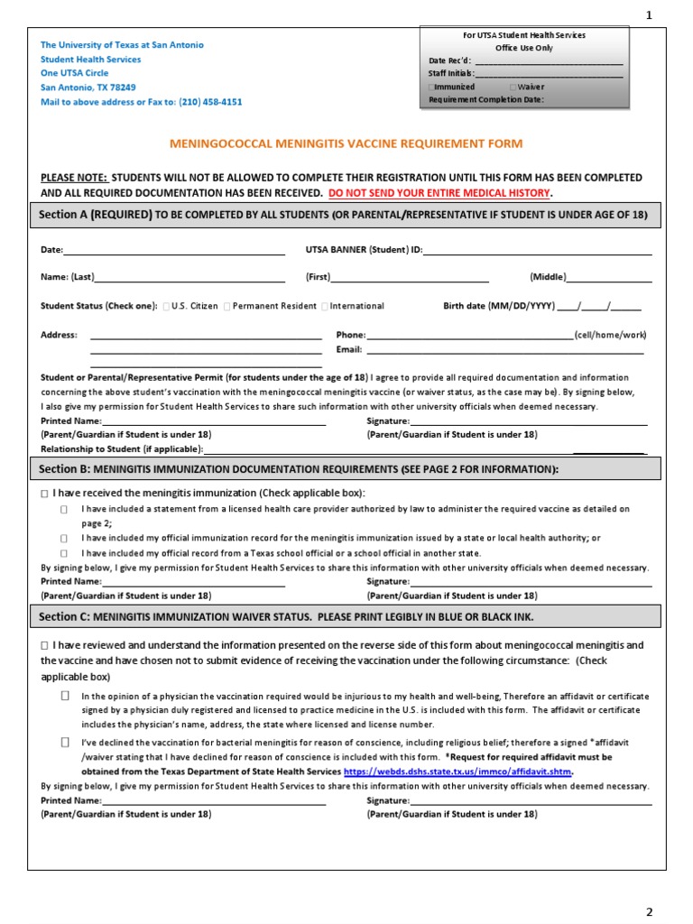 Section C: MENINGITIS IMMUNIZATION WAIVER STATUS. PLEASE PRINT LEGIBLY IN BLUE OR BLACK INK.