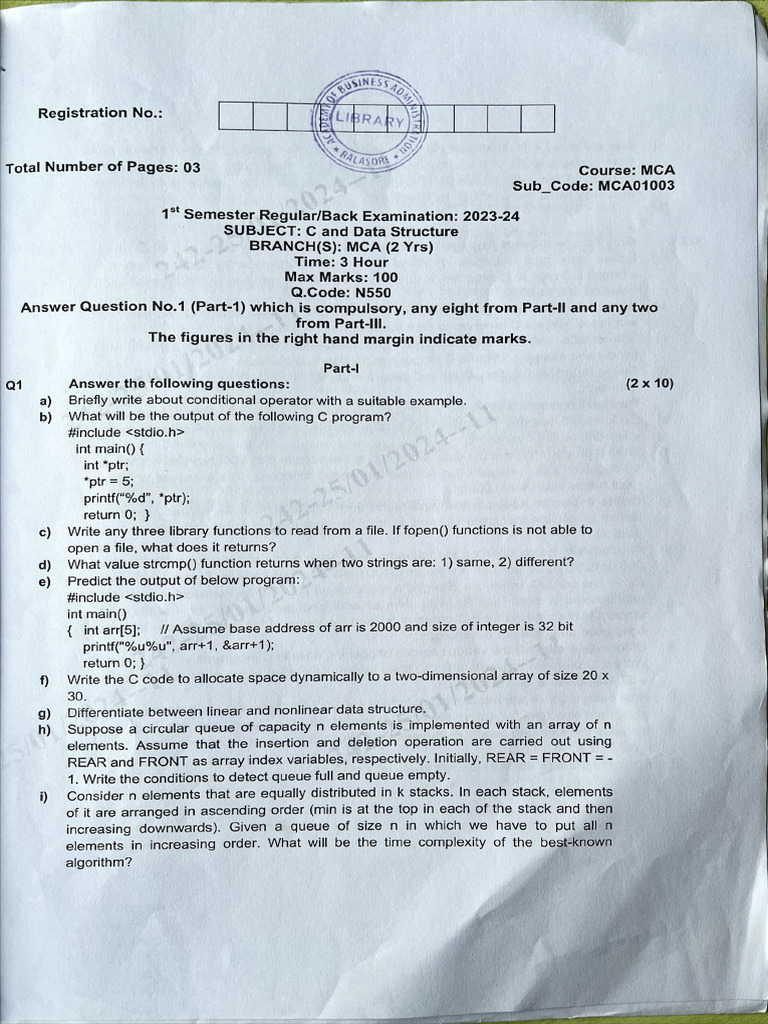 This document outlines the examination details for the C and Data Structure course for MCA students, including the structure of the exam, types of questions, and specific topics to be covered. It includes sections for compulsory questions, short answer questions, and long answer questions, addressing various programming concepts and C language functionalities. The document also specifies the maximum marks and time allotted for the exam.