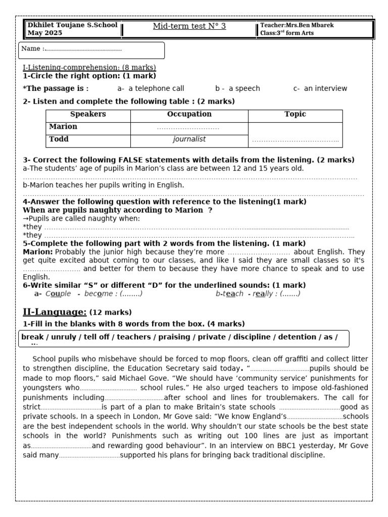 Dkhilet Toujane S.School Mid-term test N° 3 Teacher:Mrs.