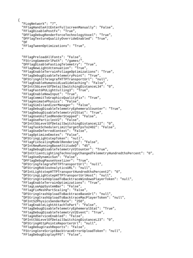 The document contains a series of configuration flags and parameters related to a software system, likely for a gaming platform. It includes settings for rendering, telemetry, network performance, and various optimizations. The flags indicate whether certain features are enabled or disabled, along with their respective values.