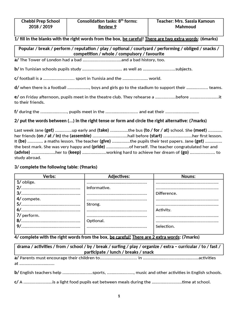 Chebbi Prep School Consolidation tasks: 8th forms: Teacher: Mrs.