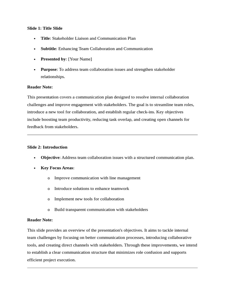 Objective: Address team collaboration issues with a structured communication plan.