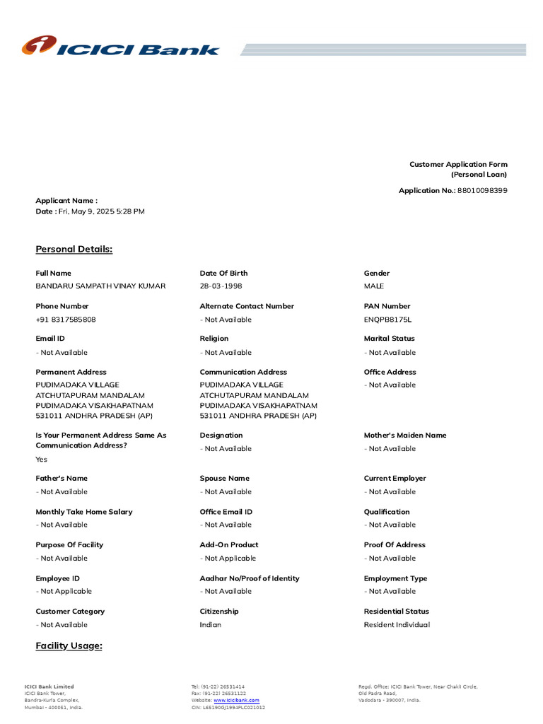 apply to ICICI Bank in the prescribed form for the Product/Facility. By applying, the Customer acknowledges that he has read, understood and
