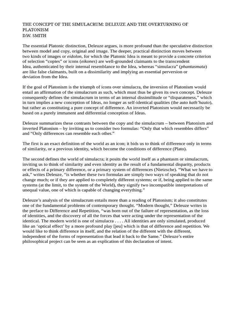 THE CONCEPT OF THE SIMULACRUM: DELEUZE AND THE OVERTURNING OF
