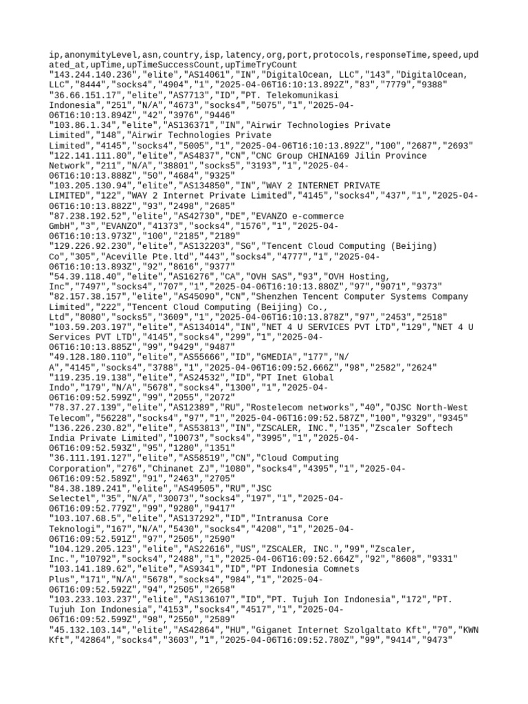 ip,anonymityLevel,asn,country,isp,latency,org,port,protocols,responseTime,speed,upd