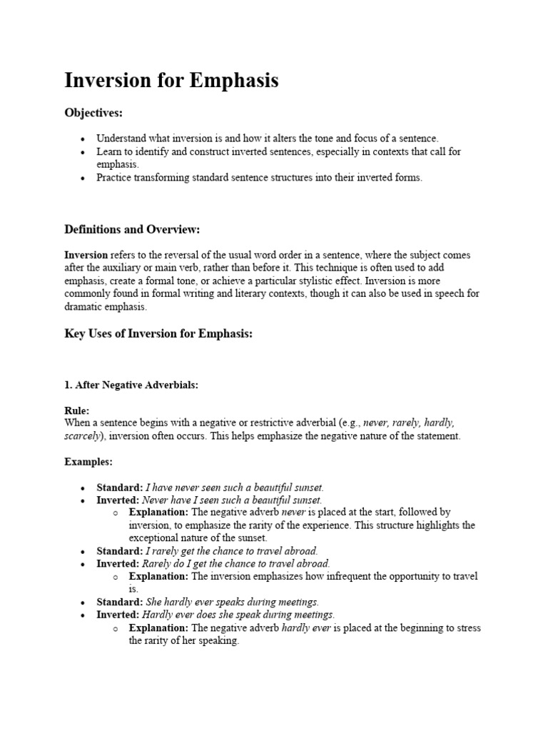 • Understand what inversion is and how it alters the tone and focus of a sentence.