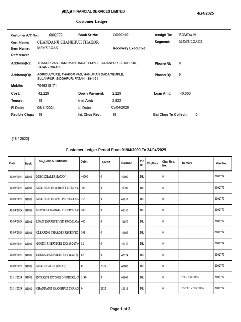 Cust. Name: CHANDANJI SHANBHUJI THAKOR Segment: MSME LOANS