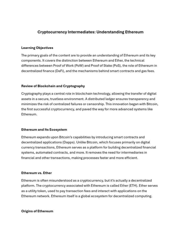 The primary goals of the content are to provide an understanding of Ethereum and its key