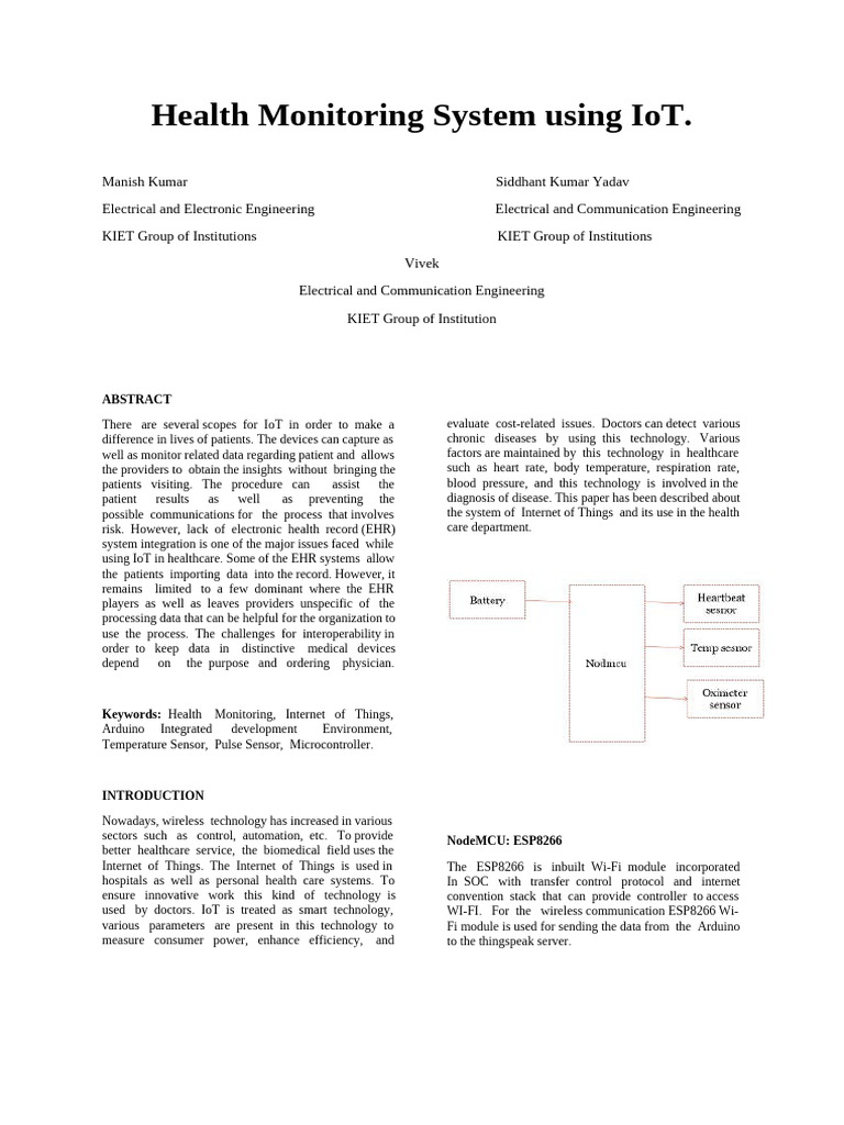 used by doctors. IoT is treated as smart technology, WI-FI. For the wireless communication ESP8266 Wi-