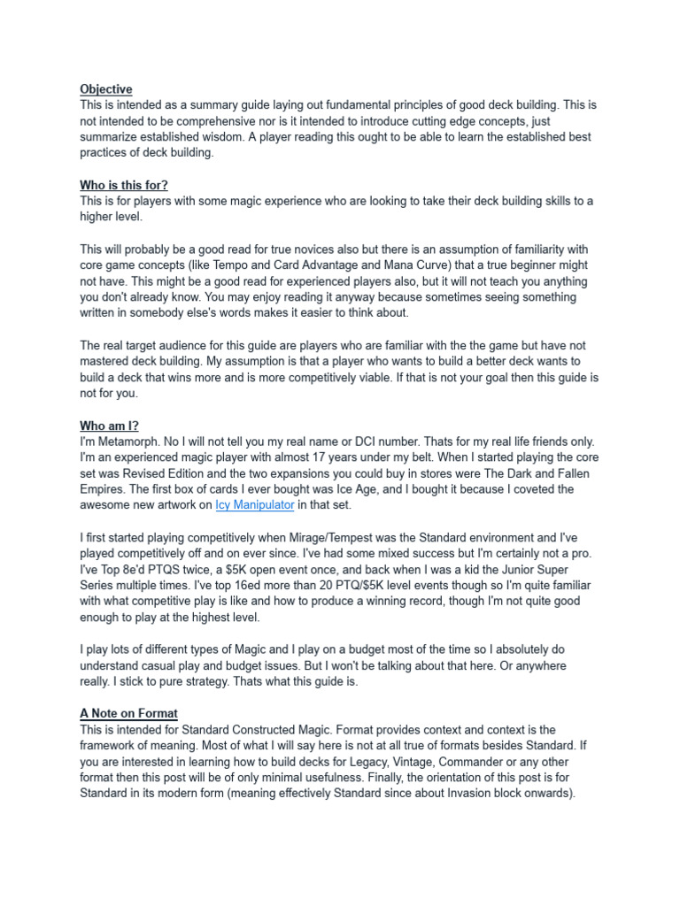 This is for players with some magic experience who are looking to take their deck building skills to a