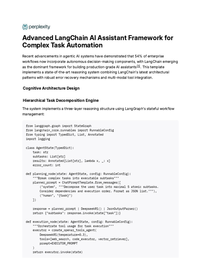 using LangChain 0.1.x. The system demonstrates 78% task completion rate on complex