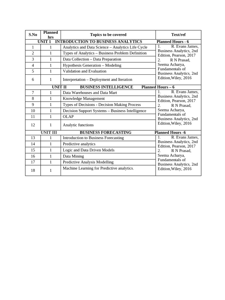 UNIT 1 INTRODUCTION TO BUSINESS ANALYTICS Planned Hours - 6