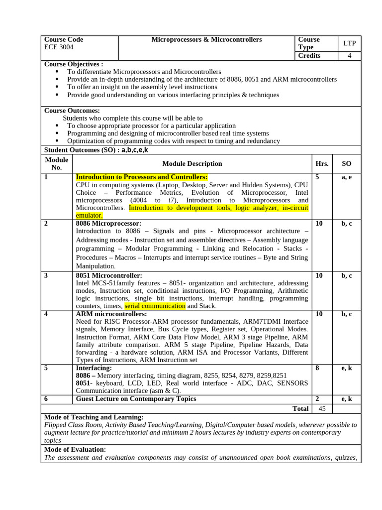 Course Code Microprocessors & Microcontrollers Course