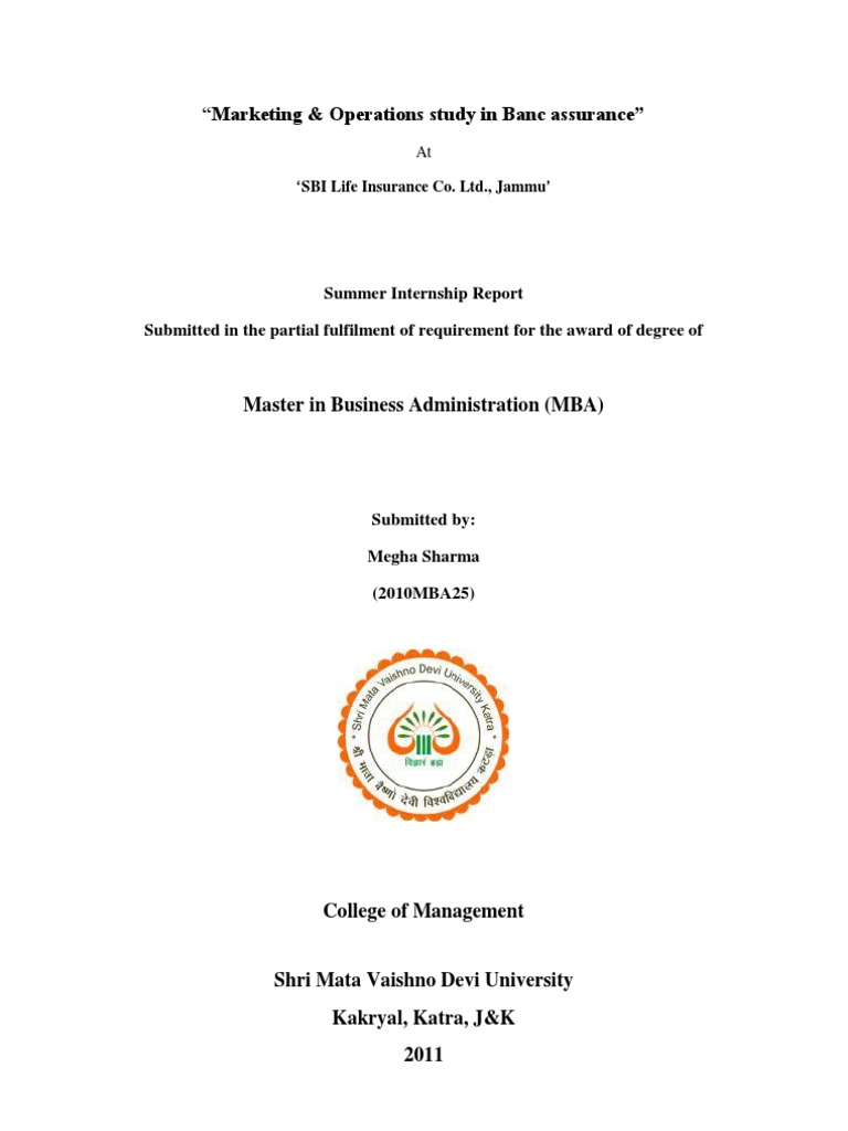 As a part of the college curriculum, I undertook the summer internship at SBI Life Insurance Co. Ltd., Jammu, Indias largest private insurer company in terms of the first year premium collection. It was a great opportunity for novices like me to work with such hard working professionals at SBI Life and learn the basic tools of trade. SBI Life is one of the leading brands in the life insurances in India and recently it overtook ICICI Prudential to become the largest private insurer in the country. Being a student of MBA, my internship was supposed to be primarily concerned with the study of the marketing & operations in banc assurance of SBI Life. But I would like to add here that what I learnt at SBI Life was not just about the marketing & operations all way long, my interactions with the people at SBI Life, the administrators and the managers, whom I found to be practical and prosaic minded, was really an eye opener. It was an experience of its kind. It was for the first time that I came in one-to-one correspondence with the business of Life Insurances and thus found that people associated with this business section really need to put in a lot of effort.