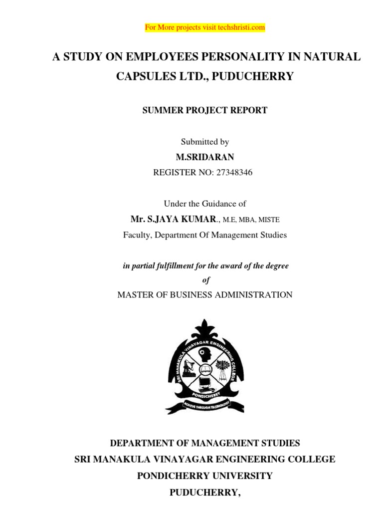 This to certify that the project work entitled A STUDY ON EMPLOYEES PERSONALITY IN NATURALCAPSULES LTD., PUDUCHERRYis a bonafide work done by M.SRIDARAN REGISTER NO: [27348346] in partial fulfillment of the requirement for the award of Master of Business Administration by Pondicherry University during the academic year 2007 2008.