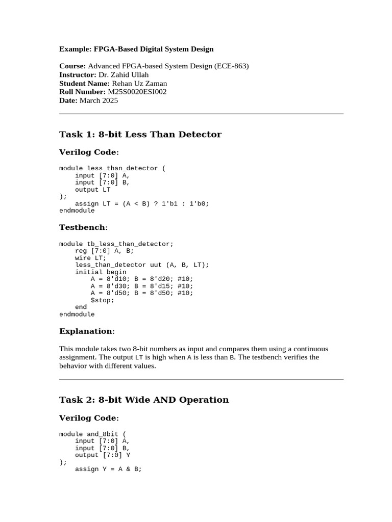 assignment. The output LT is high when A is less than B. The testbench verifies the