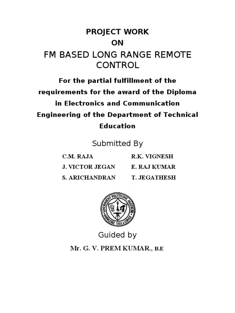 Certified that this is the bonafide recode of project work on FM BASED LONG RANGE REMOTE CONTROL done by Mr. Reg. No: of Final year Electronics & Communication Engineering during the year 2005-2006