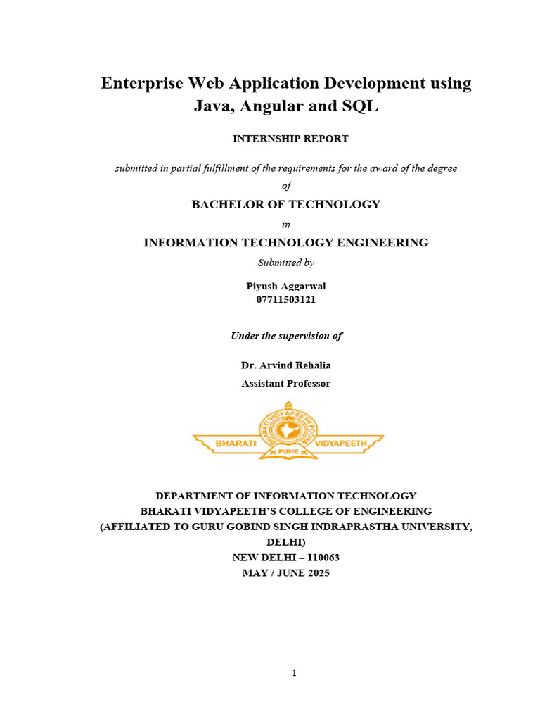Web Application Development using Java, Angular, SQL” being submitted in the