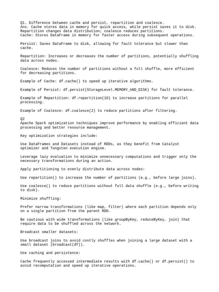 Ans. Cache stores data in memory for quick access, while persist saves it to disk.