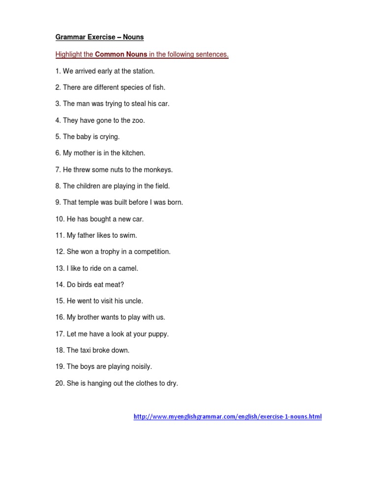 Grammar Exercise Nouns Highlight the Common Nouns in the following sentences. 1. We arrived early at the station. 2.
