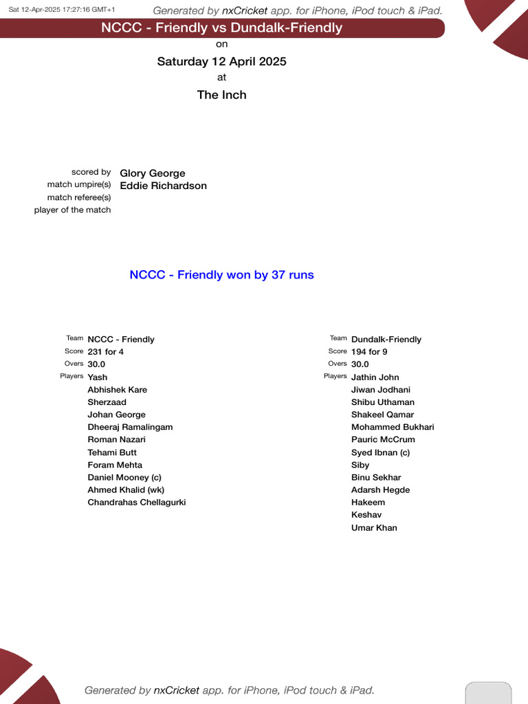 Venue: The Inch Toss won by: NCCC - Friendly Sat 12-Apr-2025