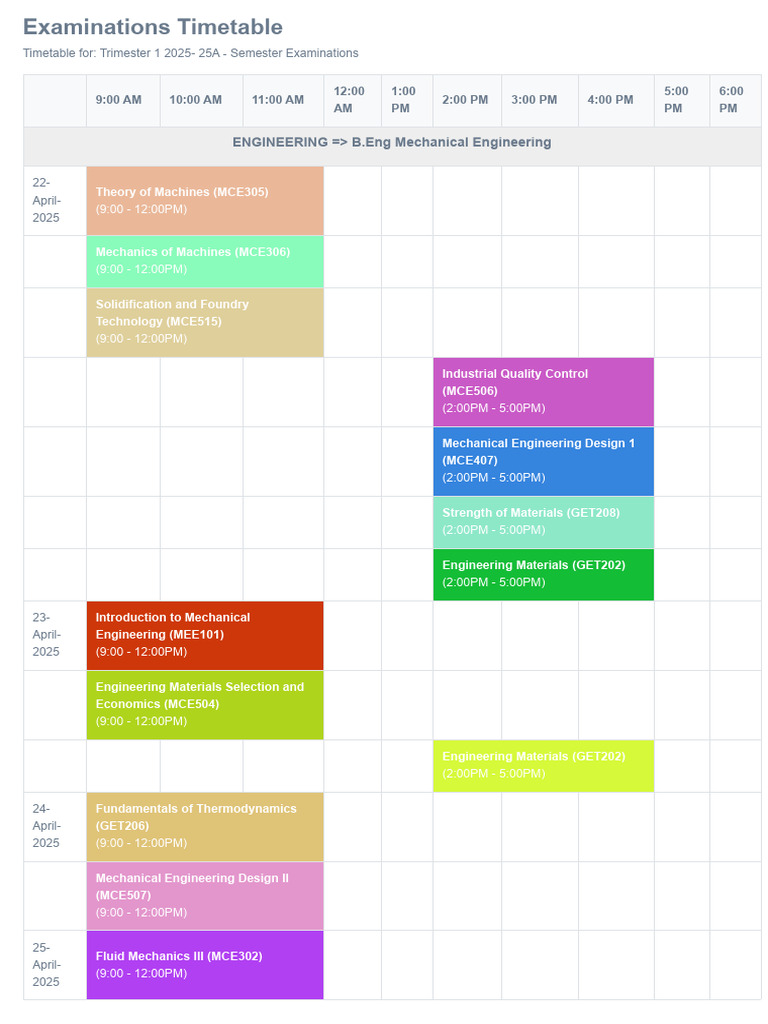 Timetable for: Trimester 1 2025- 25A ‐ Semester Examinations