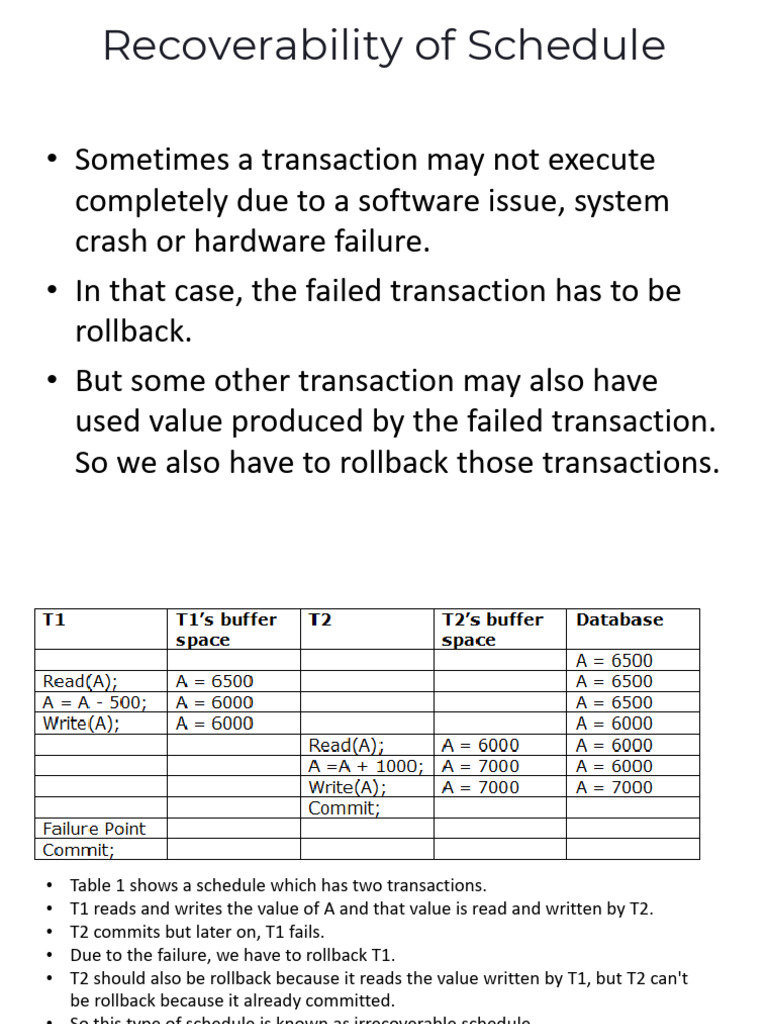 • Recoverable with cascading rollback: The schedule will be recoverable with