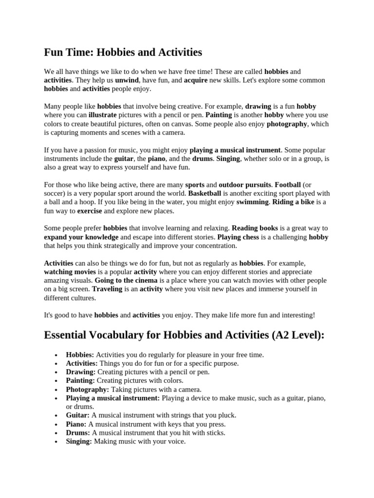 Essential Vocabulary for Hobbies and Activities (A2 Level):