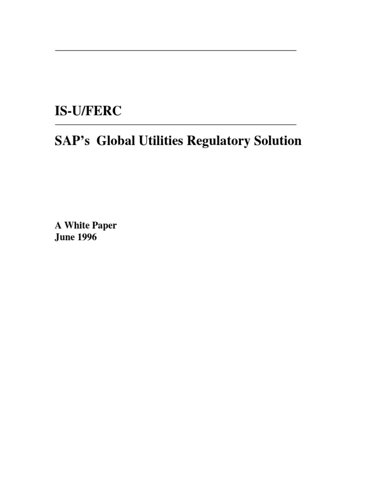 IS-U/FERC is available as add-on functionality in R/3 v3.0 for utilities. It enables the user to use standard SAP settlement rules to allocate costs within cost centers and all orders throughout the system directly to regulatory specified orders and accounts. It collects information created from PM (Plant Maintenance), PS (Project Systems) , CO (Cost Accounting), and PP (Production Planning) modules. SAP has maintained the flexibility and integrity of its drill down functionality, ease of reporting and full integration with this design. IS-U/FERC is a global regulatory reporting module providing corporations multi-state, multi-company, multi-country, multi-currency reporting capabilities. IS-U/FERC has full rollback and restart capabilities after the regulatory process has executed, simulation functionality, internal audits to verify data integrity, reconciliation capabilities, regulatory data archiving, and standard regulatory reporting for quick access to internal information and process error logging. IS-U/FERC will be delivering regulatory planning capabilities in early 1997.