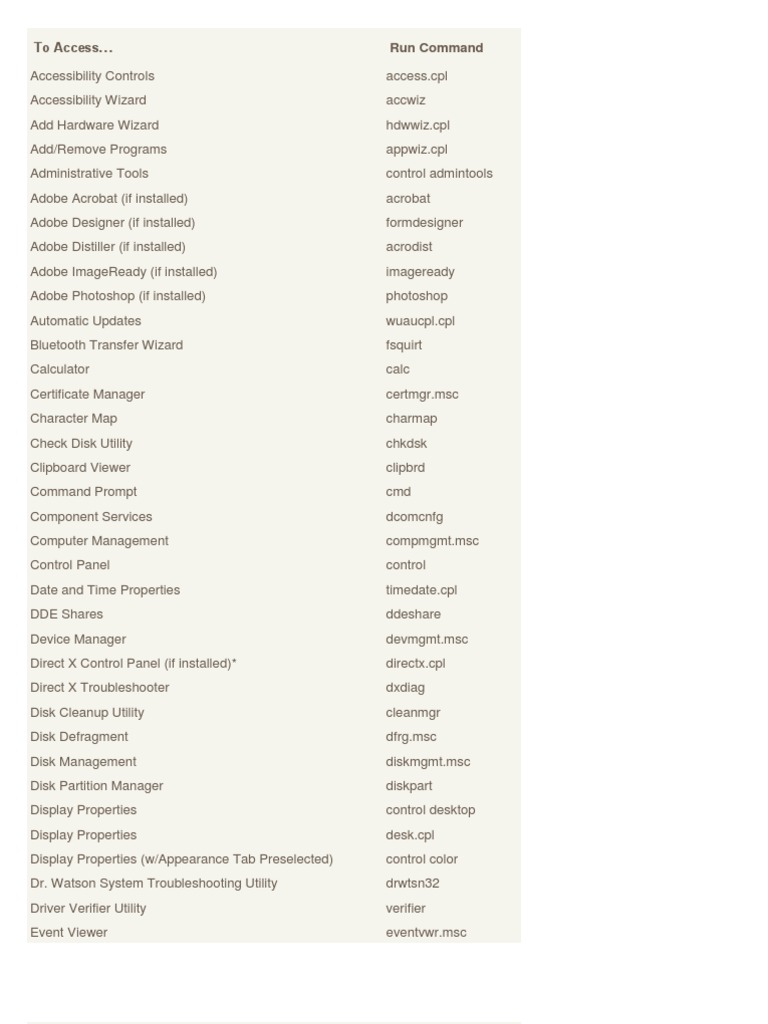 Run Command access.cpl accwiz hdwwiz.cpl appwiz.cpl control admintools acrobat formdesigner acrodist imageready photoshop wuaucpl.cpl fsquirt calc certmgr.msc charmap chkdsk clipbrd cmd dcomcnfg compmgmt.msc control timedate.cpl ddeshare devmgmt.msc directx.cpl dxdiag cleanmgr dfrg.msc diskmgmt.msc diskpart control desktop desk.cpl control color drwtsn32 verifier eventvwr.msc