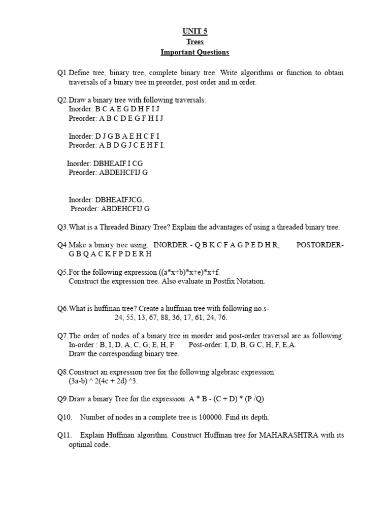 Q1.Define tree, binary tree, complete binary tree. Write algorithms or function to obtain